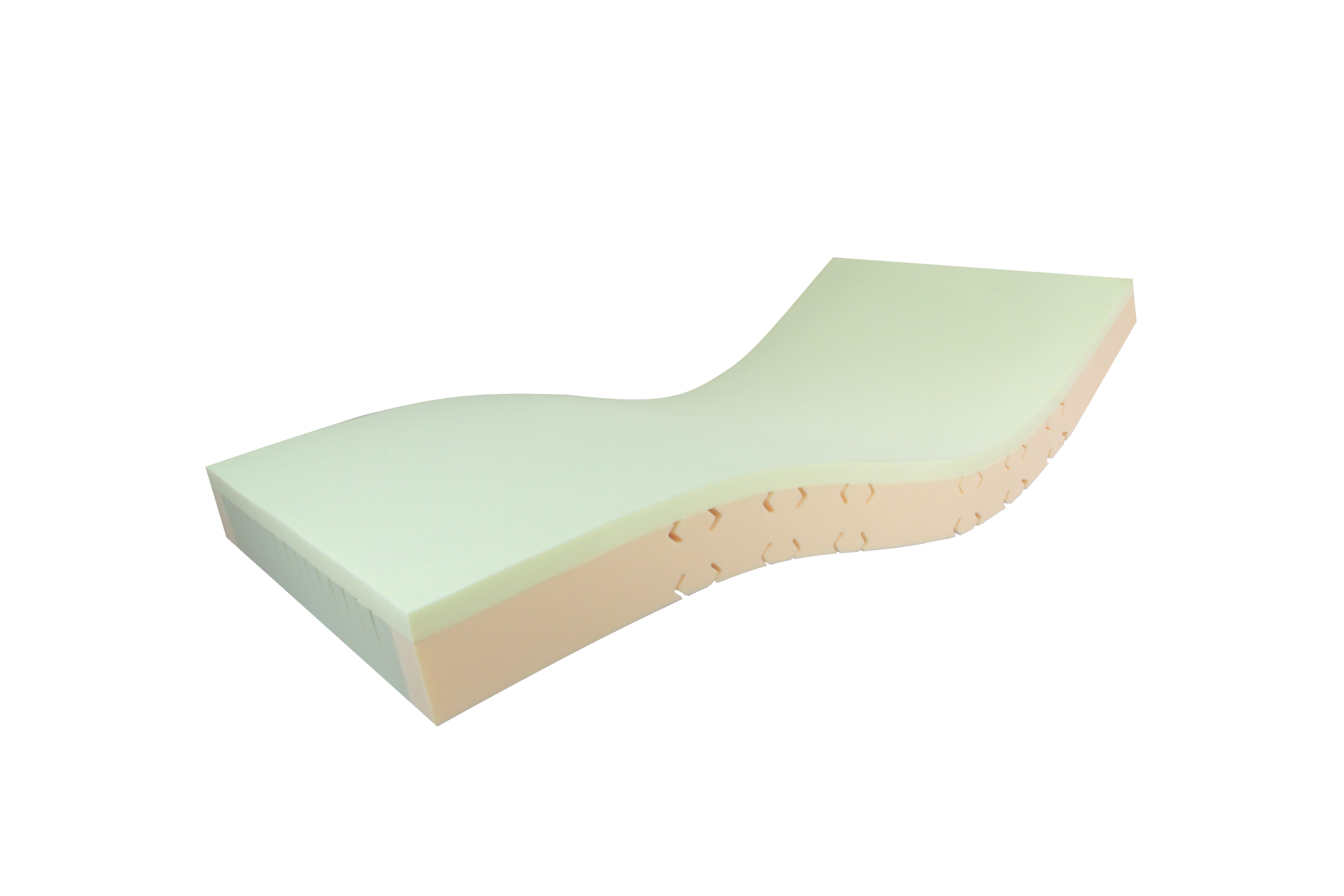 - 16 cm hohe Weichlagerungsmatratze mit würfelartiger Innenstruktur (Auflagefläche je 4 x 4 cm bei einer Höhe von 5 cm), einer verstärkten Randzone mit Duplex-Schnitt sowie einer durchgehenden viscoelastischen Auflagefläche