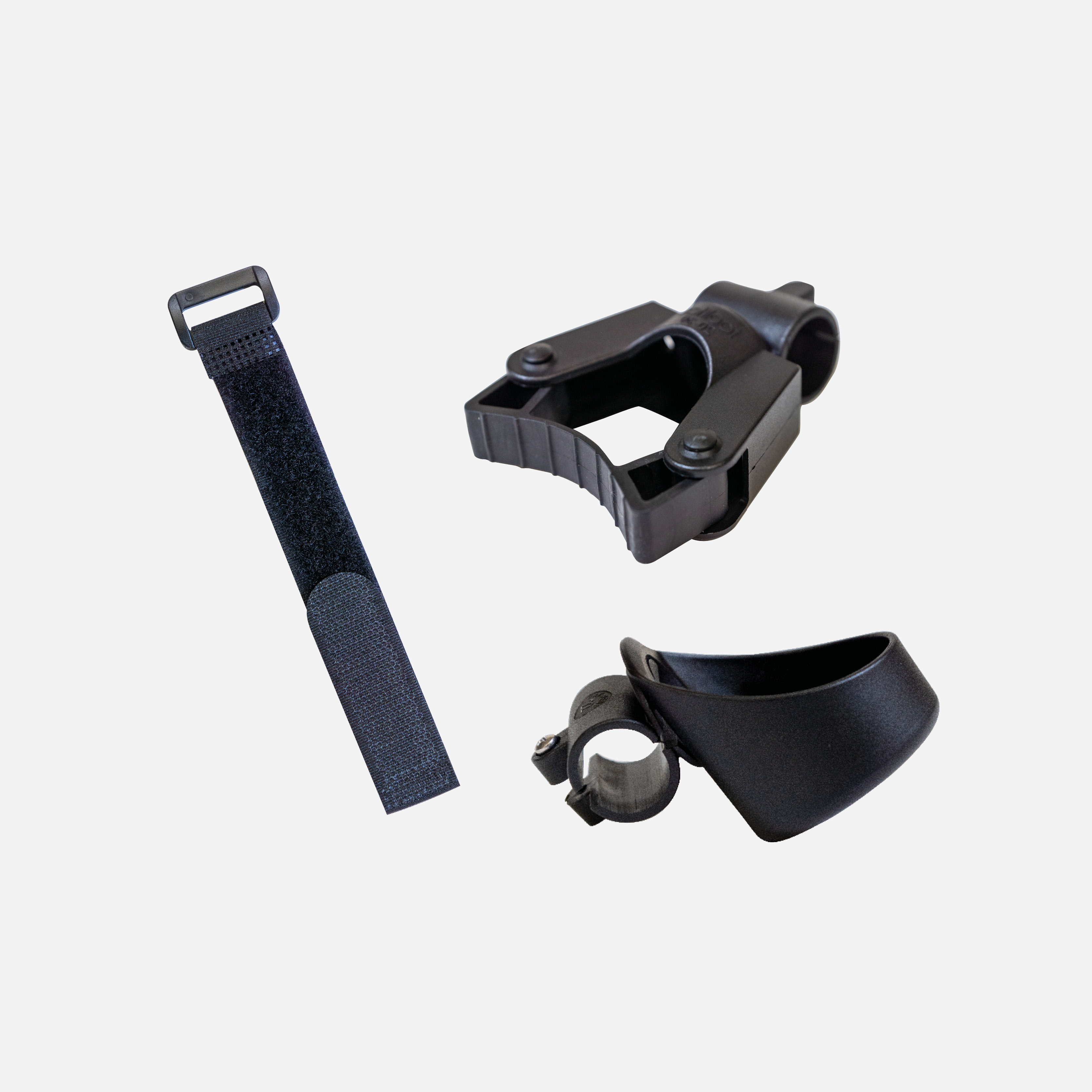 Das Set besteht aus der Stockhalterung, zwei Rohrklammern (Durchmesser: 22 mm), einer Kletthalterung und einem Köcher.
